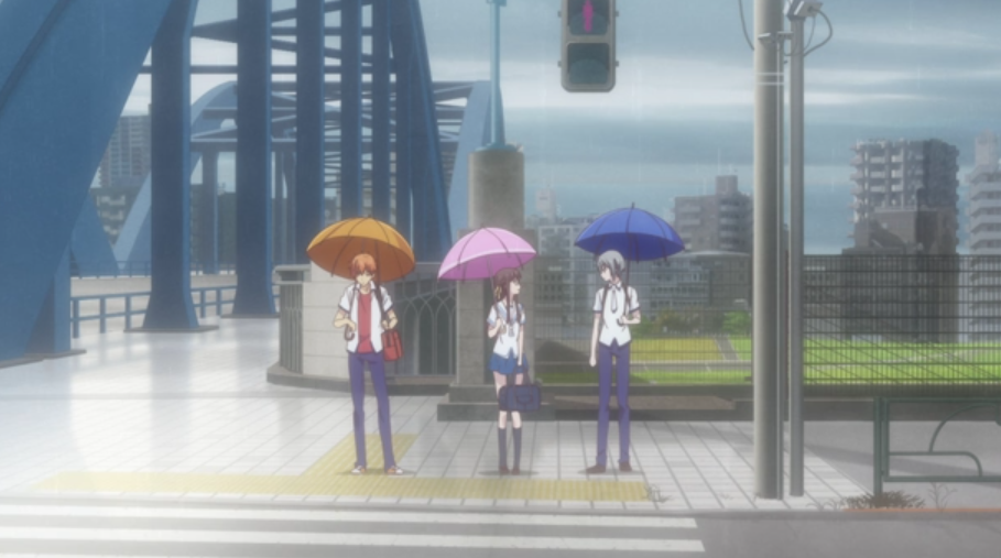 Fruits Basket, once Tohru had recovered from her brief cold, brought rain, and anyone who’s seen the original no doubt had the same reaction as me to the sight of Tohru, Yuki and Kyo standing under their umbrellas.